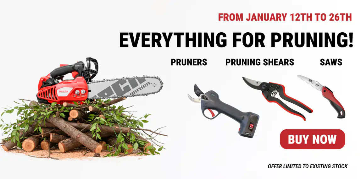 Battery-powered and manual pruning shears, pruners, binders, saws, axes, and shear accessories.