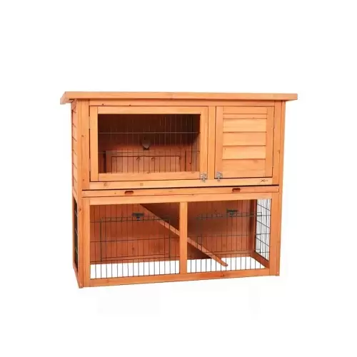 Casa para coelhos em madeira tratada de abeto durável, telhado com revestimento asfáltico e com uma gaveta plástica para facilitar a limpeza. O primeiro andar é separado por 1 porta e no rés-do-chão tem 2 portas em rede.