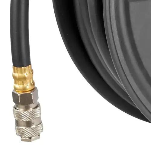 Com uma mangueira em PVC de alta resistência e um sistema de recolhimento automático, este acessório permite estender e recolher a mangueira com facilidade, mantendo desta forma o espaço de trabalho arrumado e evitando assim dobras ou danos prematuros.