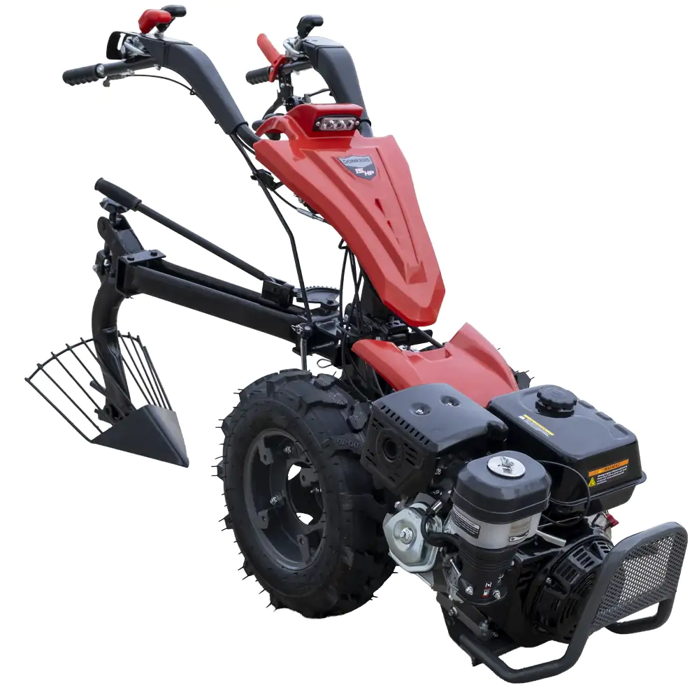 Mecanismo Descentrável: O braço principal possui um sistema de cremalheira e bloqueio que permite deslocar o arrancador lateralmente em relação ao motocultivador, facilitando assim o trabalho alinhado com o camalhão.