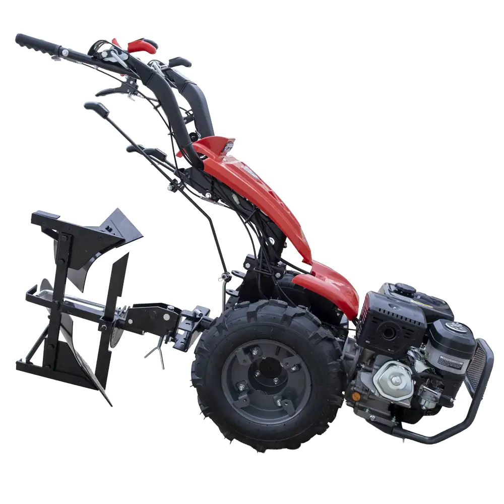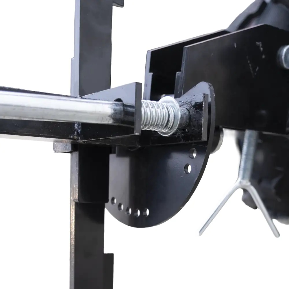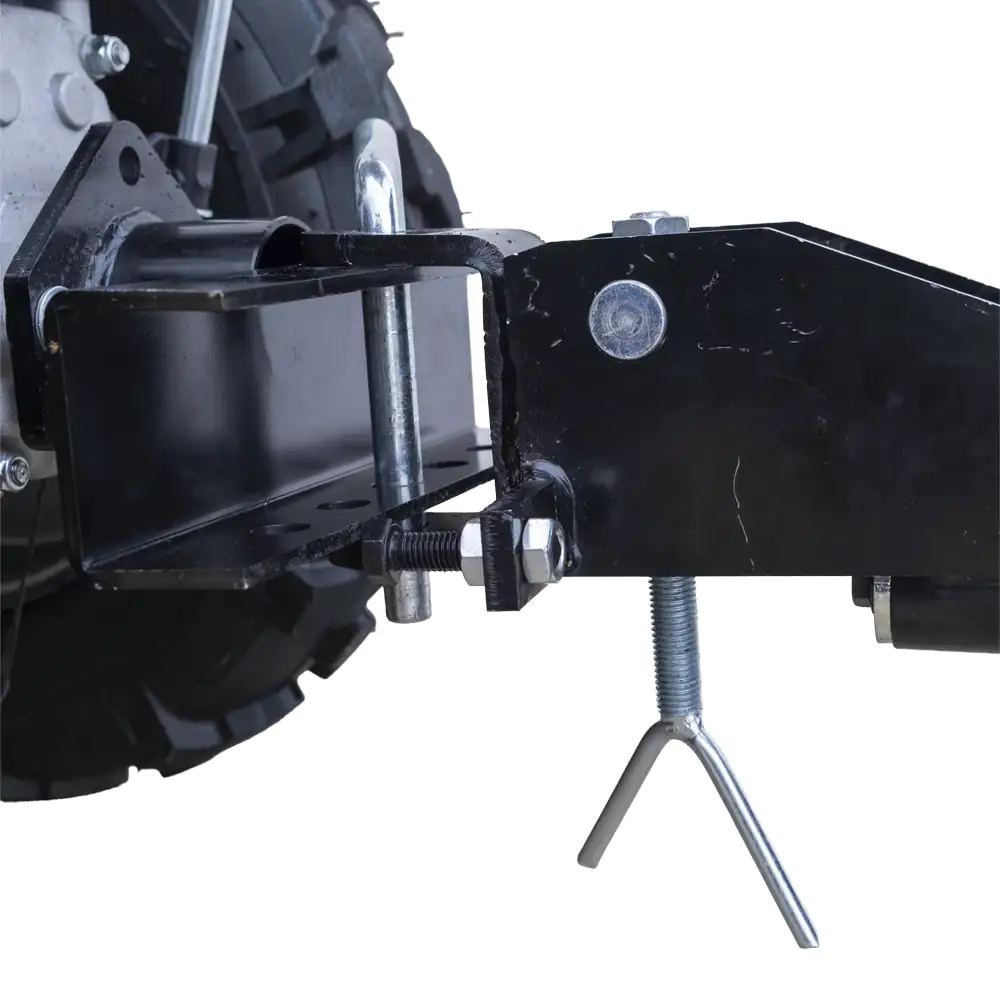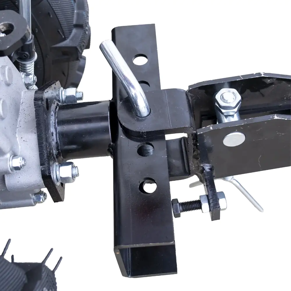 Sistema de Engate: Possui um cabeçote de fixação robusto que se acopla diretamente ao suporte traseiro do motocultivador.