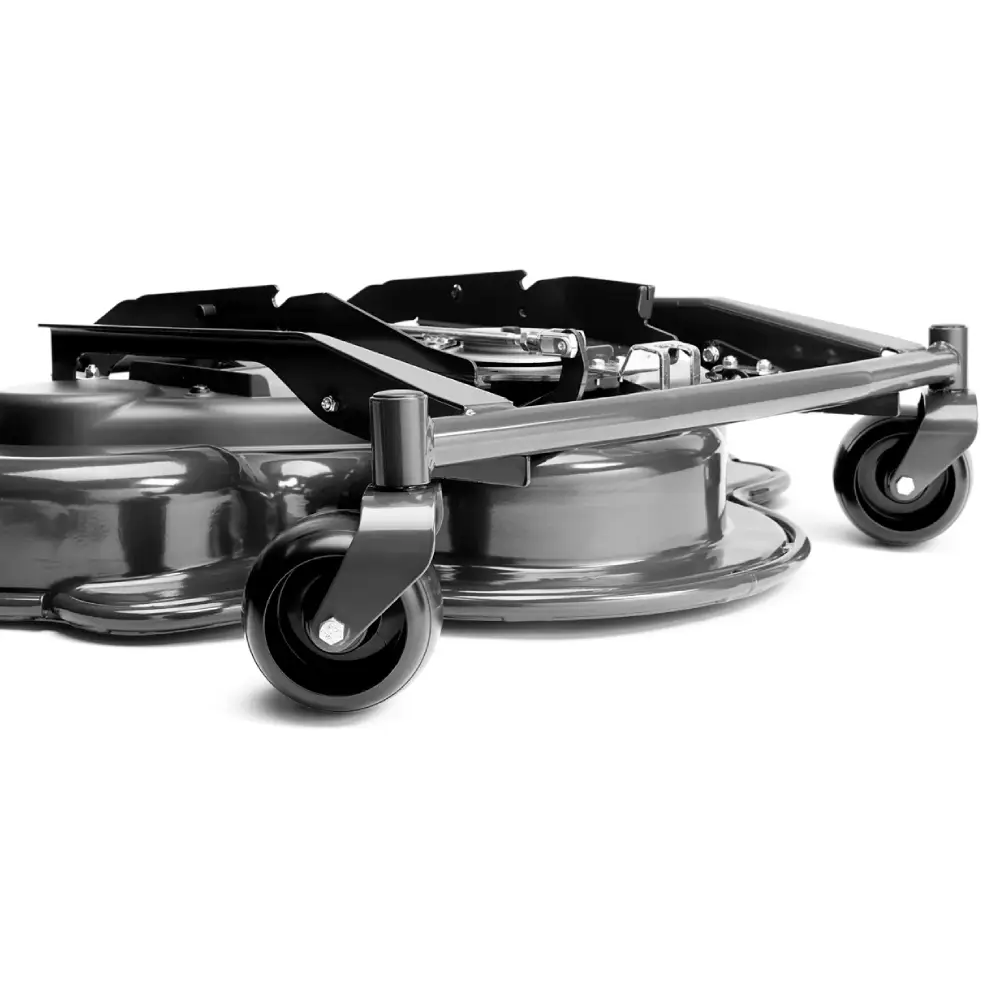 Equipada com rodas rotativas para um trabalho mais suave nos giros e para evitar danificar o relvado.