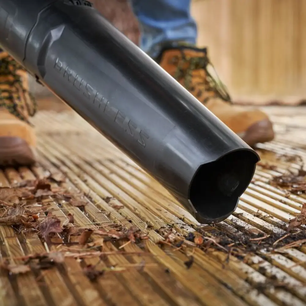 Para detritos mais pesados, o soprador está equipado com um modo de reforço para um nível extra de potência, de até 410 CFM (11,6 m³/min), e um raspador incorporado para mover material obstinado, húmido ou compactado.