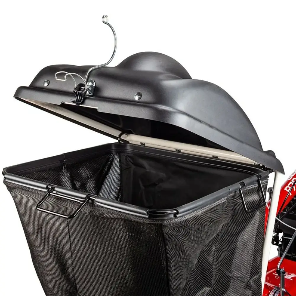 O cesto de 185 litros oferece grande capacidade de recolha, reduzindo a necessidade de paragens, enquanto as rodas dianteiras garantem mobilidade.