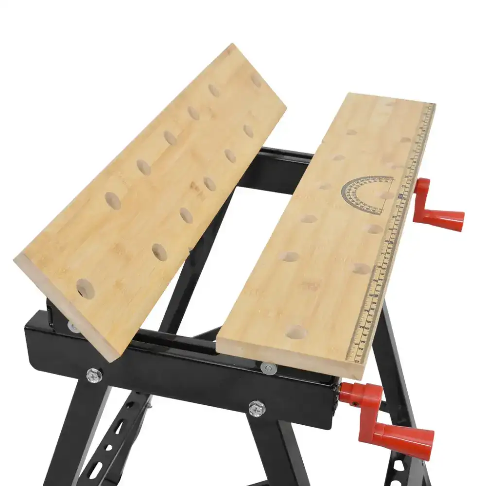 O tampo em bambu de alta qualidade oferece um superfície robusta em resistente, enquanto que o torno integrado e as diversas posições de fixação permitem segurar com firmeza tábuas, vigas ou outros materiais, garantindo a precisão e segurança em cada tarefa. Para maior facilidade de uso, o tampo inclui esquadro e régua incorporados para tornar medições e alinhamentos mais rápidos e precisos durante o trabalho.