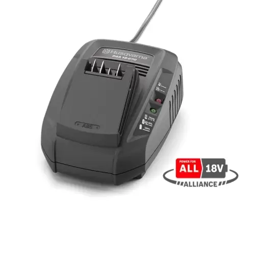 Compacto Carregador de Bateria Husqvarna Aspire 18V com indicador led, compatível com todas as baterias de 18V do programa 18V Power For All da Husqvarna. Carregador para baterias de 2.5 e 4.0Ah.