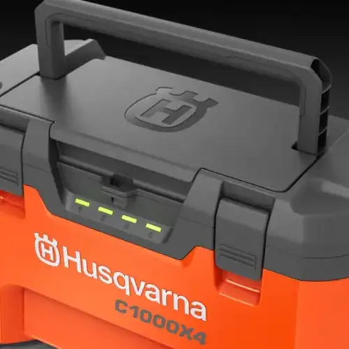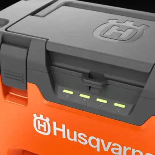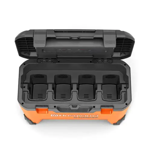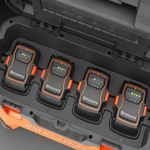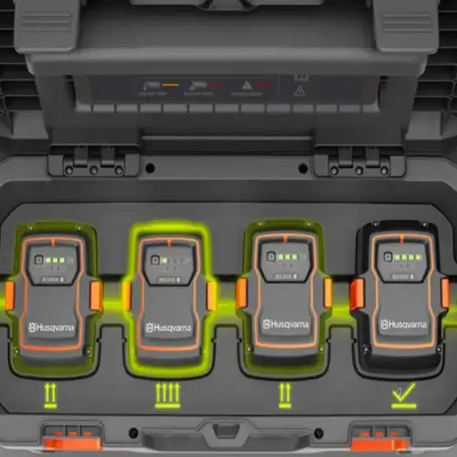Este Multi-Carregador da Husqvarna permite o carregamento simultâneo de alta potência de até quatro baterias Husqvarna BLi-X 36V numa unidade e, graças ao balanceamento de carga inteligente, todas as baterias serão carregadas de forma rápida e eficiente.