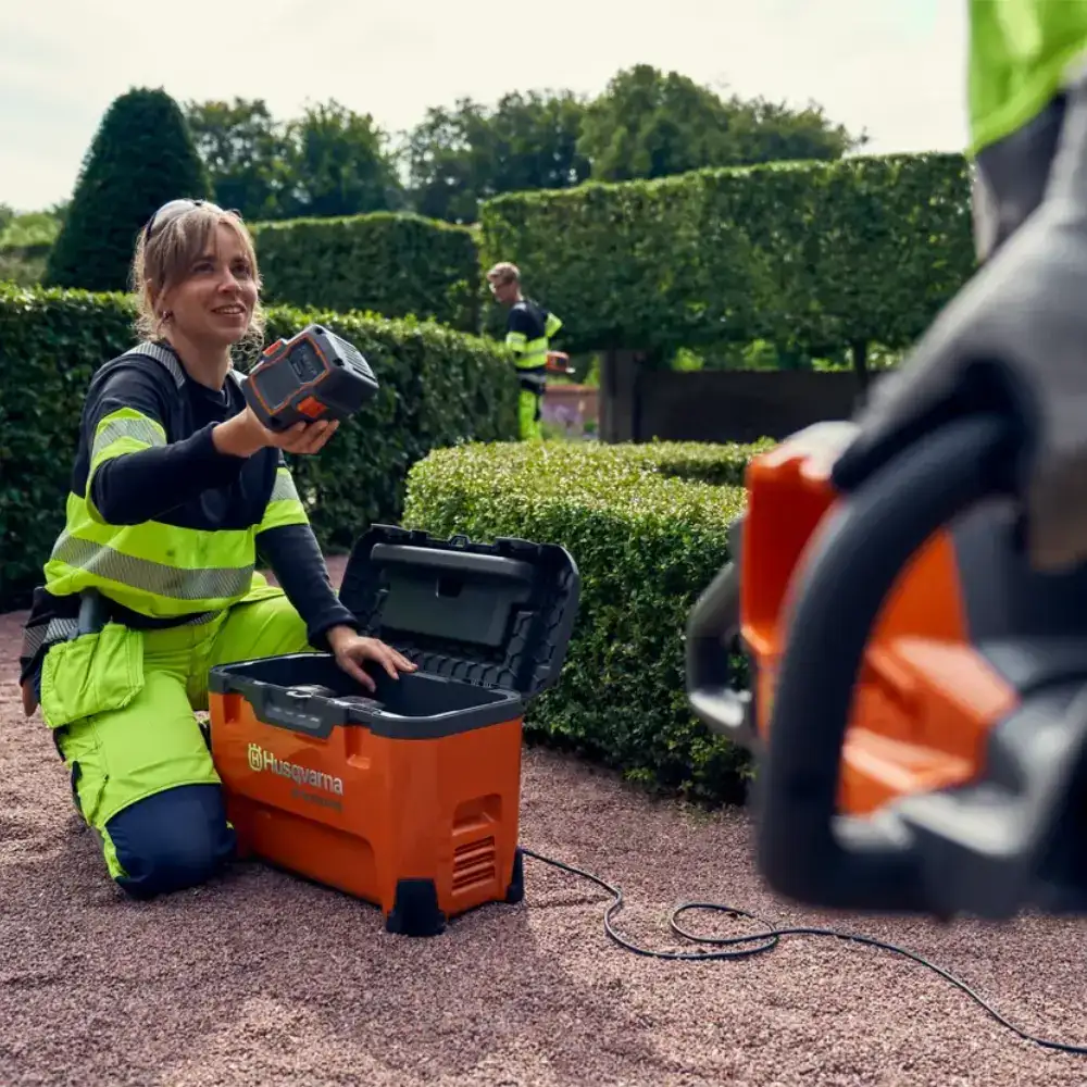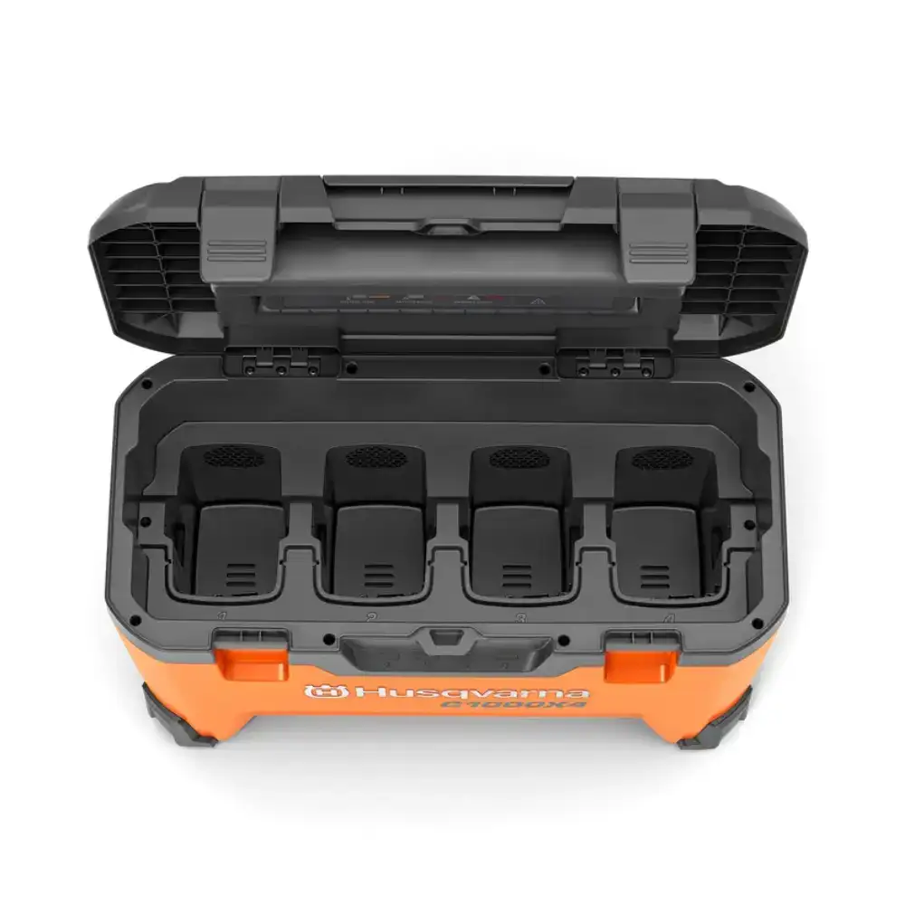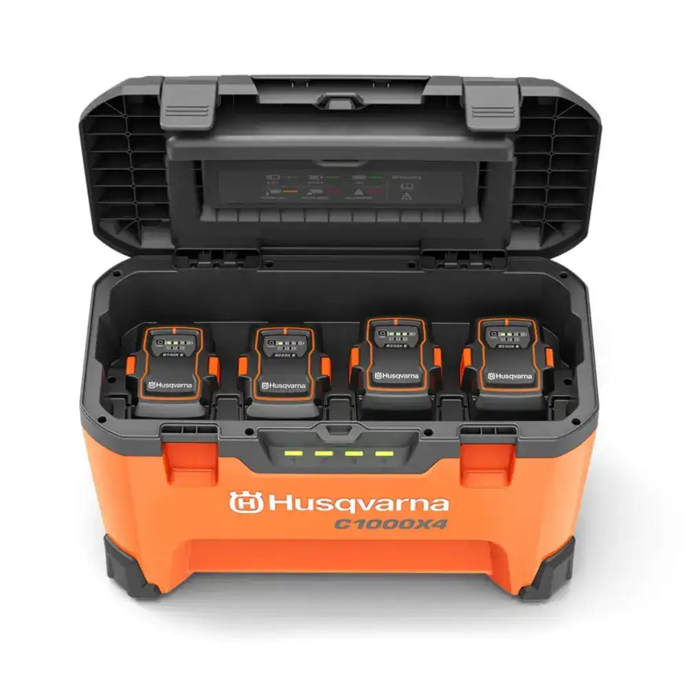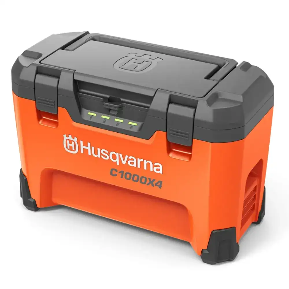 Multi-Carregador Husqvarna 4 Bat 40-C1000X4 para carregar onde quiser, seja na oficina, no local de trabalho, no seu carro ou atrelado.