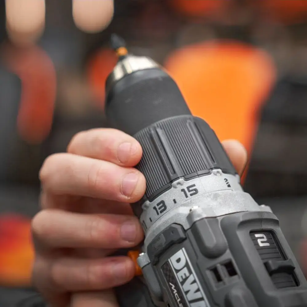 A transmissão de 2 velocidades proporciona maior tempo de funcionamento e durabilidade e o controlo de binário ajustável de 14 posições permite aparafusar de forma consistente numa variedade de materiais. Tanto as 2 velocidades como as 14 definições de binário dão-lhe o máximo controlo nos trabalhos de perfuração e fixação.