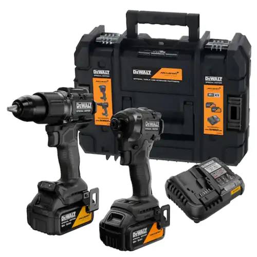 Este Kit inclui um Berbequim Aparafusador de Percussão XR 18 V sem escovas, com um binário máximo de cerca de 90 Nm, capaz de perfurar madeira, metal e alvenaria com eficiência e controlo. Conta também com uma Aparafusadora de Impacto XR 18 V compacta e potente, que atinge aproximadamente 205 Nm de binário para aplicações exigentes de fixação e montagem.