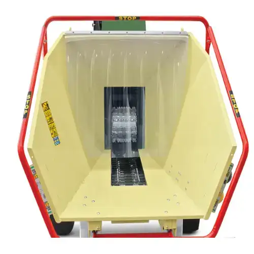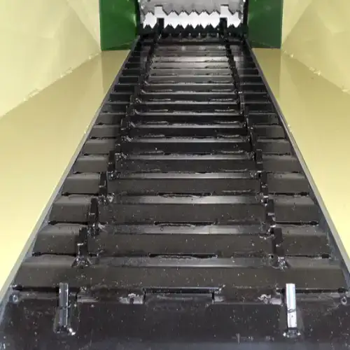 A alimentação do biotriturador Negri é feita através de um tapete e rolo hidráulico com velocidade e direção de rotação ajustáveis, isto assegura um fluxo contínuo e controlado do material.