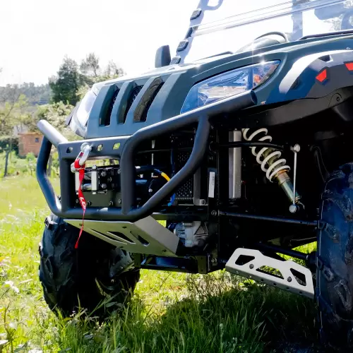 O vidro acrílico frontal e a proteção do carter e dos braços de suspensão previne danos causados por pedras, galhos e outros obstáculos durante a condução off-road em terrenos difíceis.