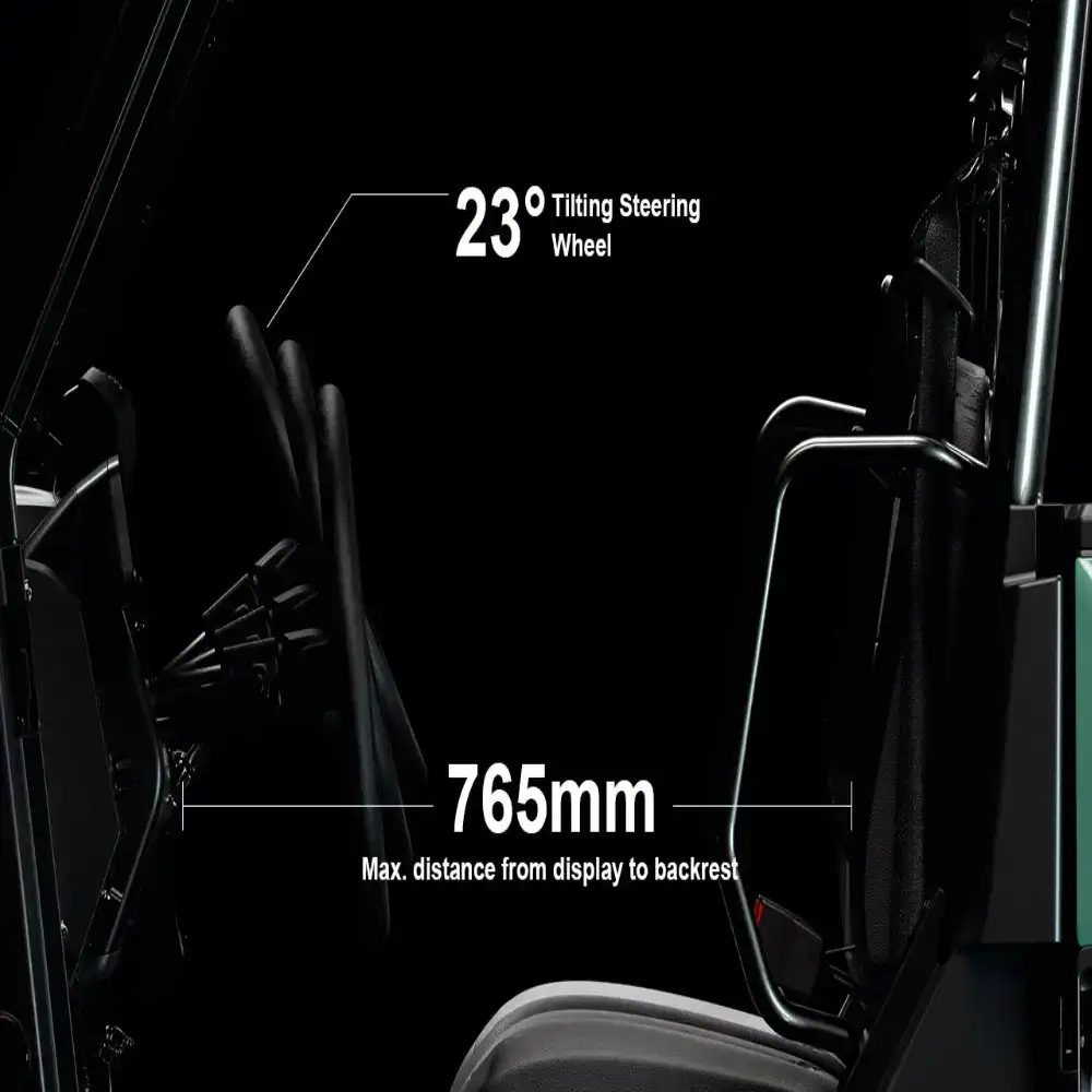 Cabine Espaçosa - A distância entre o painel de controlo e o banco é de 765 mm, e o ângulo de inclinação do volante de 23° garante um espaço confortável na cabine para o condutor e até 2 passageiros.