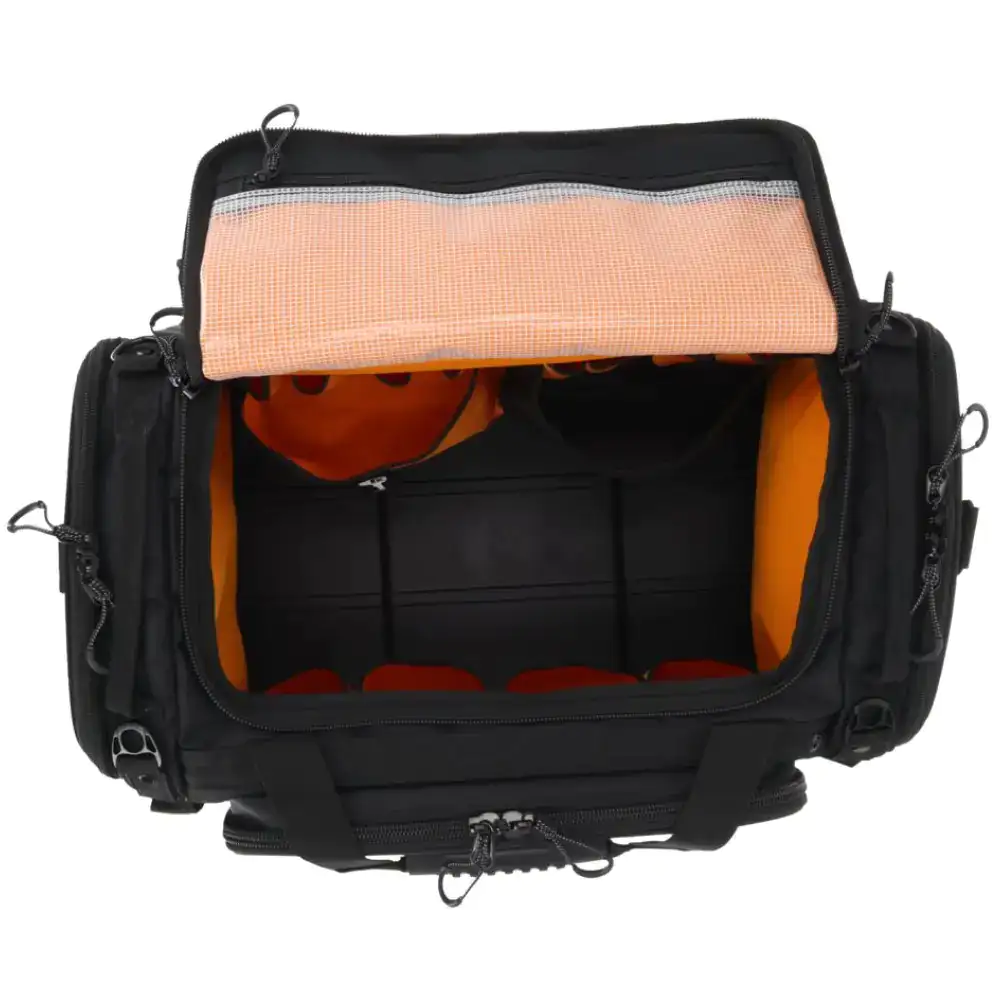 Inclui bolsos para ferramentas elétricas, baterias e acessórios. Além disso, inclui um bolso transparente com fecho para artigos de acesso rápido.