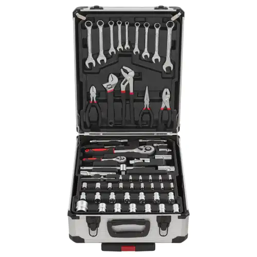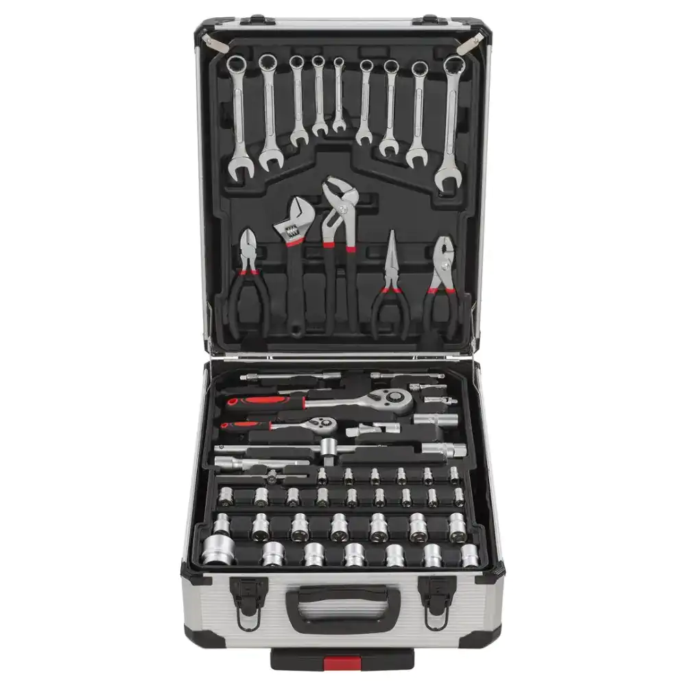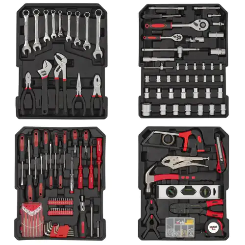 O conjunto inclui uma ampla seleção de ferramentas, como chaves de caixa, chaves combinadas, chaves Allen, alicates, martelo, fita métrica, nível, serrote manual, x-ato, chaves de fendas, bits de aparafusamento e vários acessórios de fixação, entre muitos outros elementos indispensáveis para trabalhos gerais. Esta diversidade de peças faz com que a caixa funcione como uma solução “tudo-em-um”, adequada tanto para utilizadores ocasionais como para quem pretende ter sempre um conjunto completo de Ferramentas disponível.