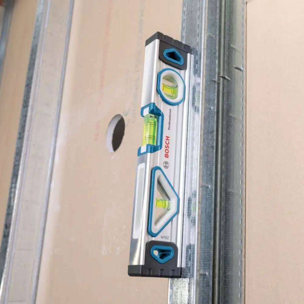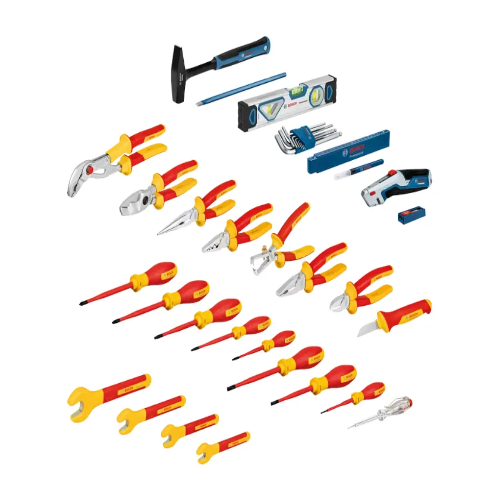 A mala para eletricistas Bosch Profissional inclui tambem 16 ferramentas adicionais, como um martelo, nível magnético, régua,  marcador, chaves sextavadas, x-ato e lâminas.