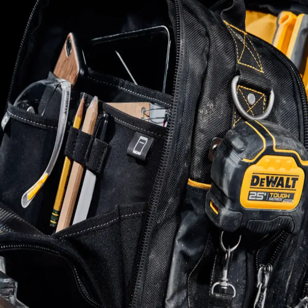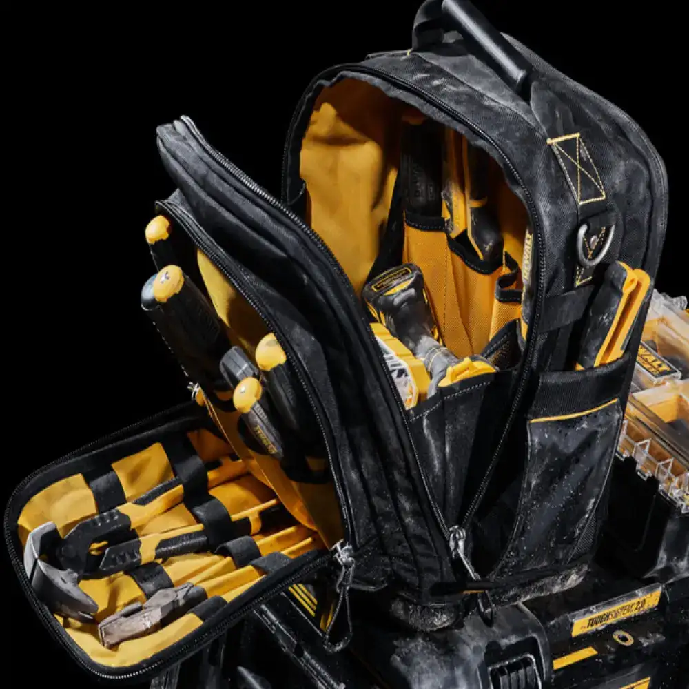 Mochila de 11" ToughSystem™ 2.0 DEWALT®, feita com materiais híbridos para grande resistência ao desgaste e proteção do contéudo.