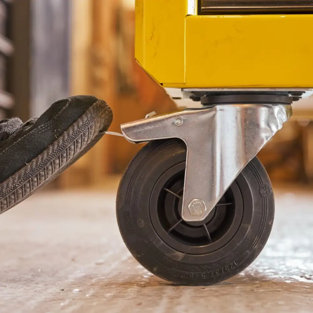 4 rodas duráveis de 125 mm de diâmetro cada e seguras devido ao seu travão, presente numa delas.