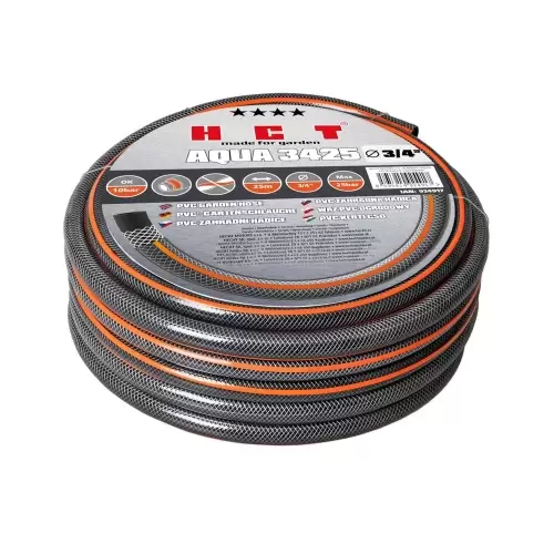 Mangueira de Jardim HCT 3425 – Mangueira durável em PVC de três camadas feita de uma combinação de PVC amolecido e trançado de pressão de fibras sintéticas.