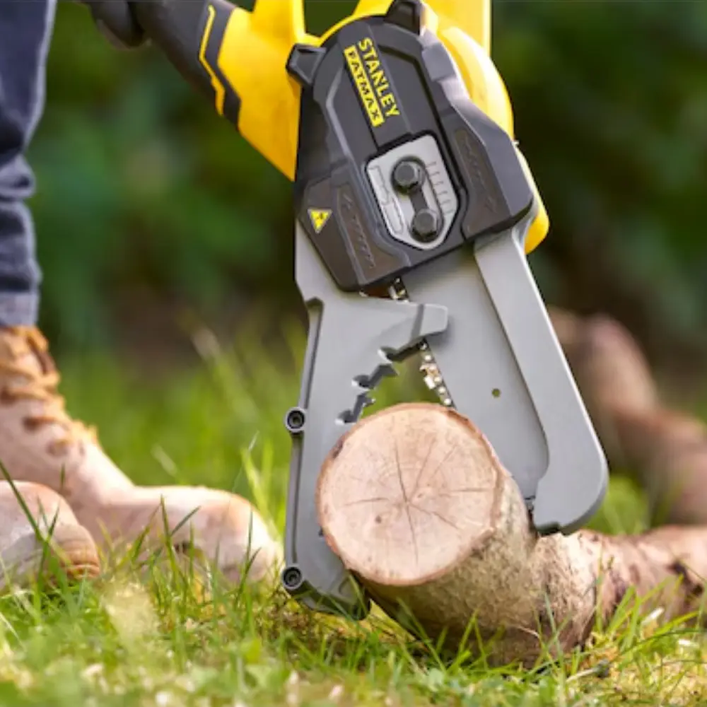 The Stanley Alligator 18V 4Ah Cordless Pruner is part of the STANLEY® FATMAX® V20 18V range of professional 18V cordless outdoor tools, featuring advanced battery technology with no memory effect and minimal self-discharge. This means the tool is ready to work anytime, anywhere and will last longer. This compact cordless pruner is ideal for pruning trees and cutting fallen branches into smaller pieces. Thanks to the patented jaw design, it effectively grips branches for fast, efficient, safe and controlled cutting. The fully enclosed blade and chain protect the user from sharp cutting teeth and the chain during operation. The pruner can only be used with both hands, which ensures greater safety and ease of use. It effectively cuts branches up to 10 cm in diameter and is equipped with a blade and a 15 cm chain. The automatic chain tensioner reduces preparation and maintenance time. The semi-automatic lubrication function ensures chain lubrication and extends its lifespan. It comes with a 4Ah V20 battery, compatible with the wide range of STANLEY cordless tools.