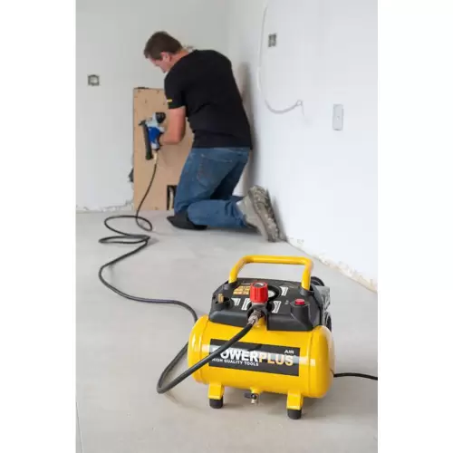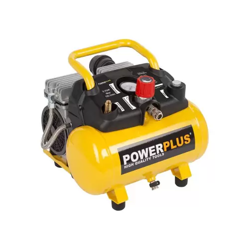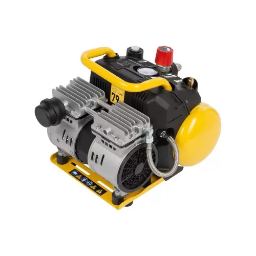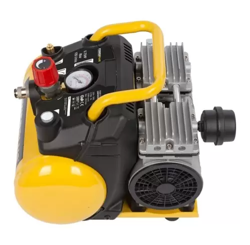 Compressor Silencioso com um débito de ar de 105 l/min, uma pressão de 8 bar e uma capacidade do depósito de 6 l, tem à sua disposição uma máquina potente. Consegue encher pneus, colchões de ar, bolas e anexa dispositivos pneumáticos também, para realizar projetos de perfuração menores.