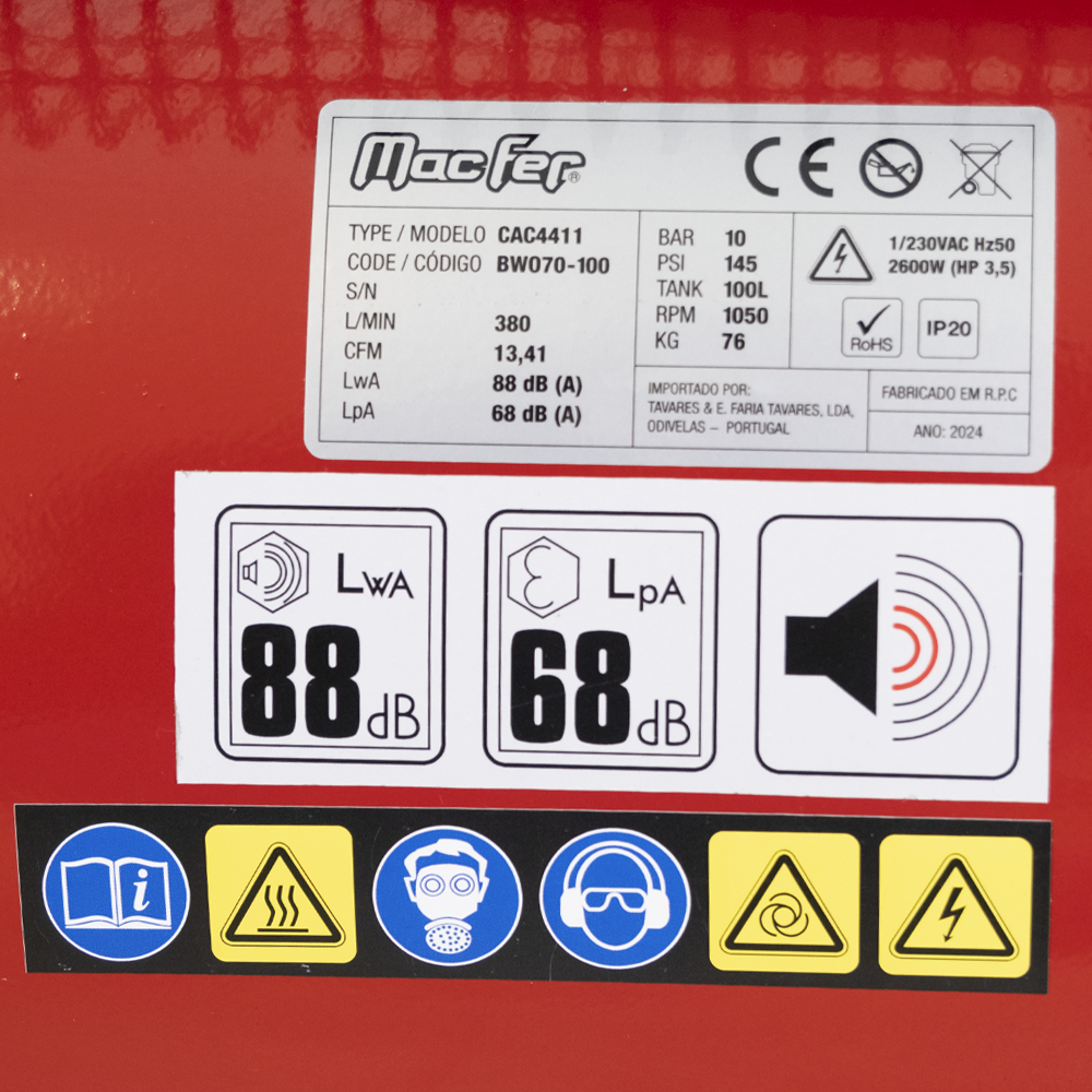 O Compressor c/Correias Macfer 100L 2600W é um compressor silencioso (68 dB)!