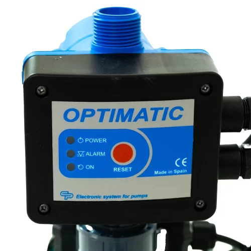 O regulador eletrónico de pressão ordena o arranque e paragem da bomba ao abrir ou fechar qualquer torneira ou válvula da instalação, mantendo o fluxo e a pressão fornecidos pela bomba elétrica. Proteção contra funcionamento a seco. Com controlador de pressão Optimatic.