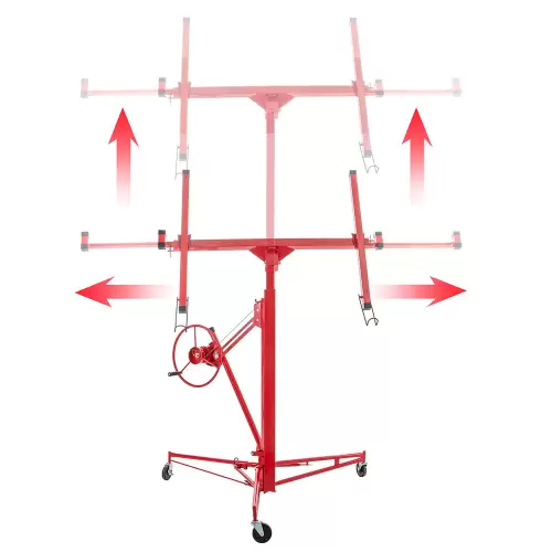 Elevador p/ Placas de Gesso MacFer portátil com rodas, projetado para facilitar a aplicação de Placas de Gesso, de até 1.22 x 4.88M, em paredes e tetos. Ideal para projetos de construção e reforma de profissionais de construção.
