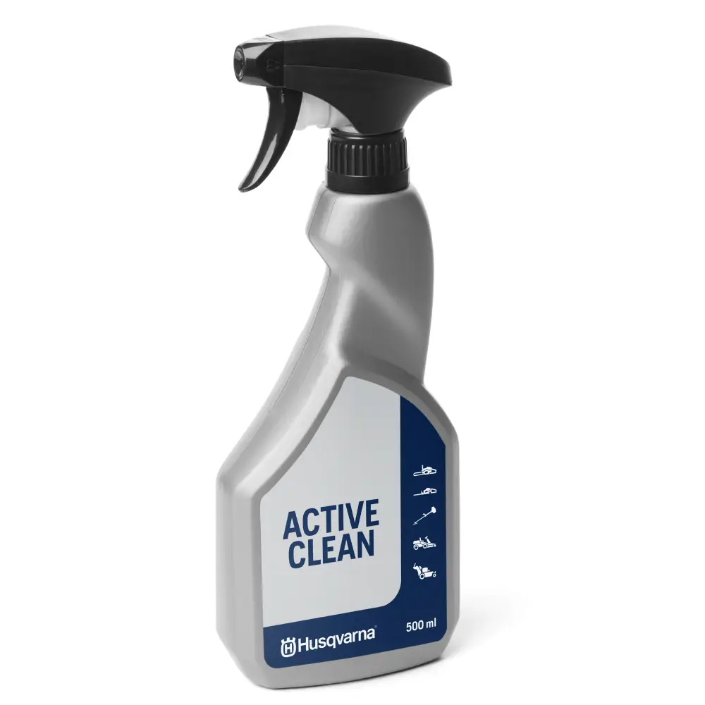 Spray de Limpeza Husqvarna Active Clean versátil, perfeito para barras e correntes de motosserras, outros equipamentos de jardim, filtros de ar de motores e até mesmo botas ou roupas.