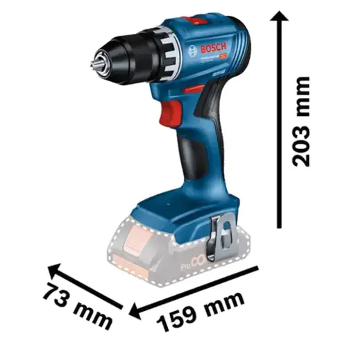 The Bosch GSR18V-45 screwdriver is equipped with a high-efficiency brushless motor that extends working hours and tool life, offering maximum performance and efficiency with a working speed of up to 1,900 rpm. It is ideal for screwing into wood or drilling into wood and metal in tight spaces. Its compact design is easy to handle and work with. Technical Specifications Table border="1" style="border-collapse: collapse; width: 99.8862%; height: 72px;"> 18px;"> Number of revolutions at no load (1st gear / 2nd gear) 0 – 500 / 0 – 1,900 rpm Clamping range of the chuck, min./max. 1.5 / 13 mm Weight without battery 0.9 kg L x W x H 159 x 73 x 203 mm