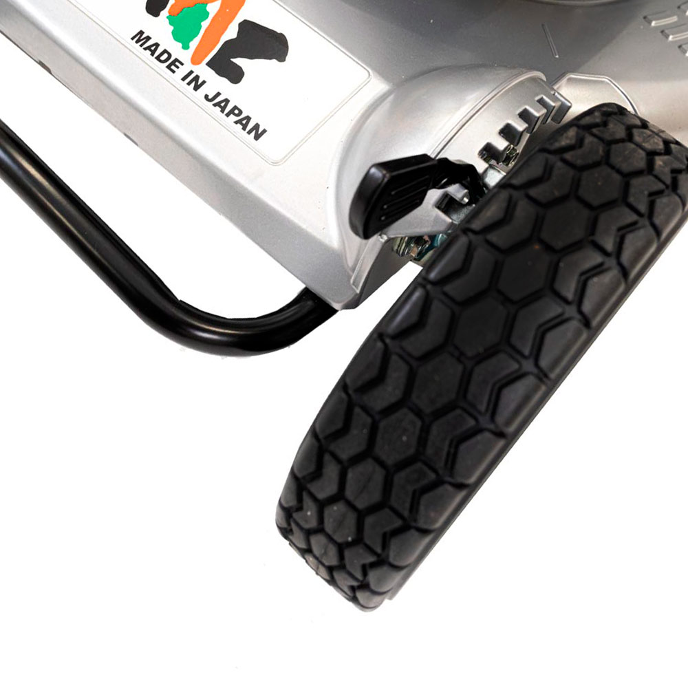 As  jantes e rodas em alumínio sustentam e mantêm o equilíbrio do Corta-Relva