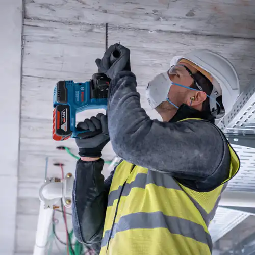 The Bosch GBH 18V-22 Professional SDS Plus rotary hammer is compact and powerful, designed to provide greater comfort and control when drilling in concrete, wood, and metal. Thanks to its ergonomic design and optimized center of gravity, this tool is especially comfortable for work above head level, reducing user strain during extended periods of use. KickBack Control and Vibration Control technologies increase safety and reduce impact on hands and arms, allowing for more stable and precise work. The integrated LED light improves visibility in the work area, ensuring greater accuracy even in low-light zones. Safety mode that shuts off the motor in case of blockage or overheating