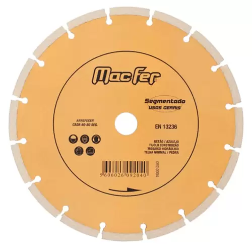 Disco Diamantado Segmentado para usos gerais com um diâmetro de 125 mm, furo de 22,23 mm e com 6,600 rotações por minuto.