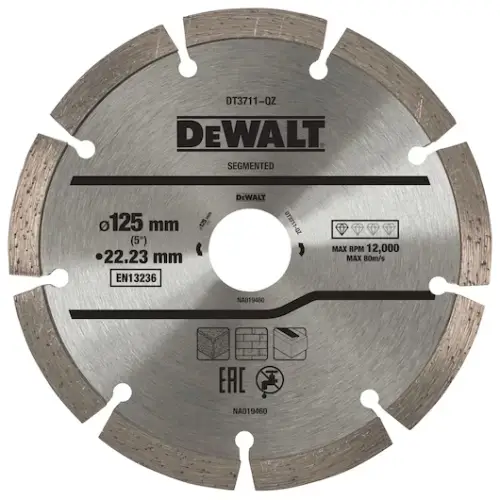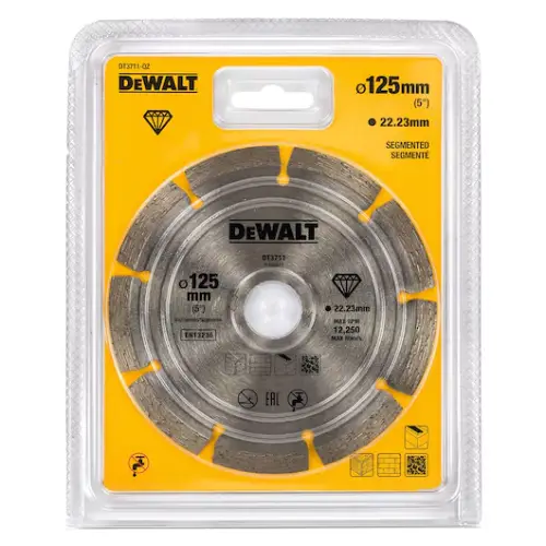 O Disco Diamantado Segmentado 125 mm DT3711-QZ da DeWALT para corte a seco é ideal para quem procura um desempenho excecional em cortes rápidos e precisos de materiais de alvenaria.