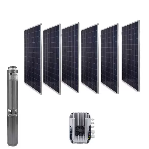 Kit composto por bombas submersíveis de 4″, motor submersível trifásico de 3 x 230V, painel elétrico para bombagem solar, painéis solares de 450 wP necessários para o funcionamento correto e apoio de painéis solares.