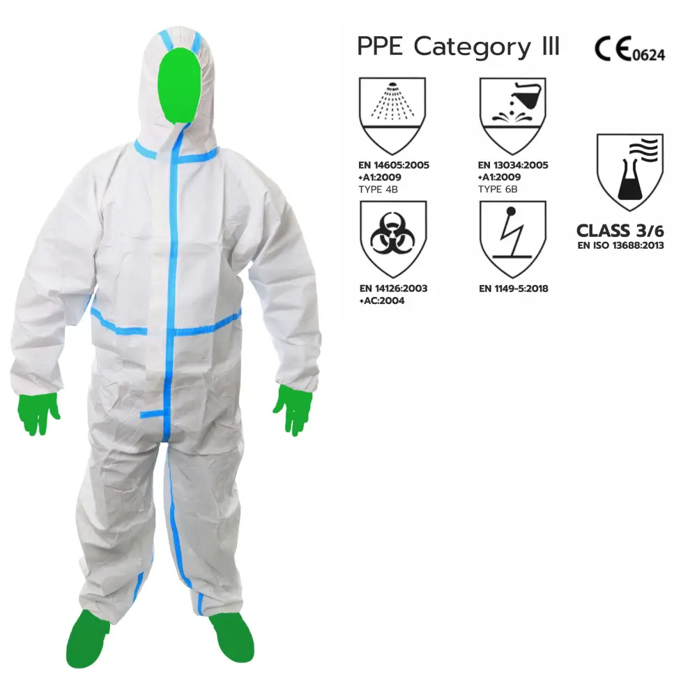 O fato segue os padrões de qualidade, conforto e resistência, tornando-o ideal para uso profissional em exposição a produtos químicos (Classe 3/6 EN ISO 13688:2013)