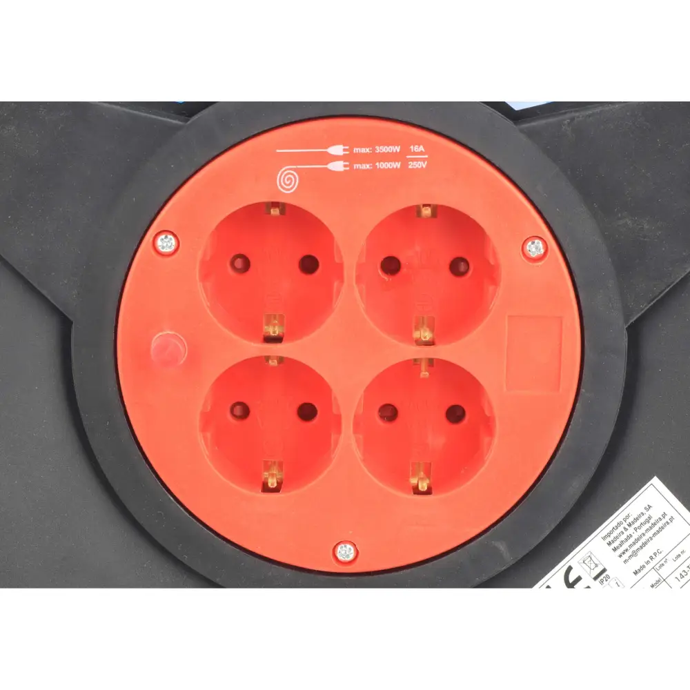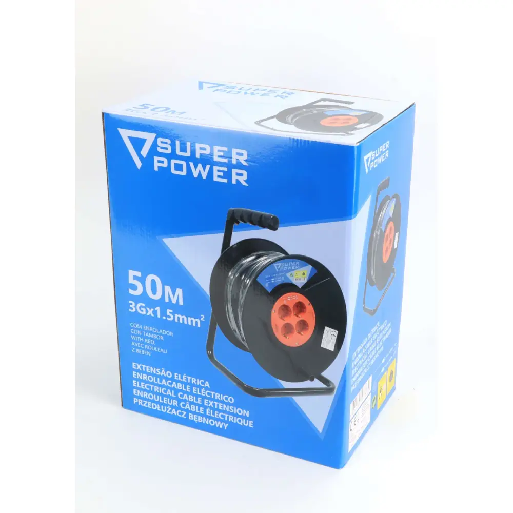 É uma extensão com enrolador metálico de 4 tomadas, comprimento de 50 metros, secção 3Gx1,5mm2, equipado com protetor térmico e com proteção anti-humidade para crianças.