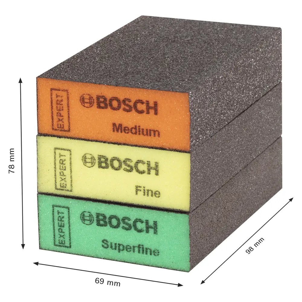 Com 3 peças de lixa, cada uma com 69 x 97 x 26 mm, este conjunto oferece um desempenho excecional, sendo 5 vezes mais durável do que as lixas Bosch C420 tradicionais.