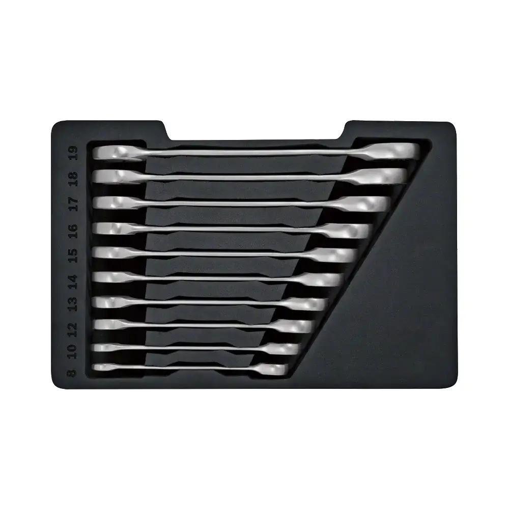 O conjunto inclui 10 chaves nos tamanhos mais utilizados: 8, 10, 12, 13, 14, 15, 16, 17, 18 e 19 mm, cobrindo uma ampla gama de necessidades, desde trabalhos de precisão até aplicações de binário leve e médio.