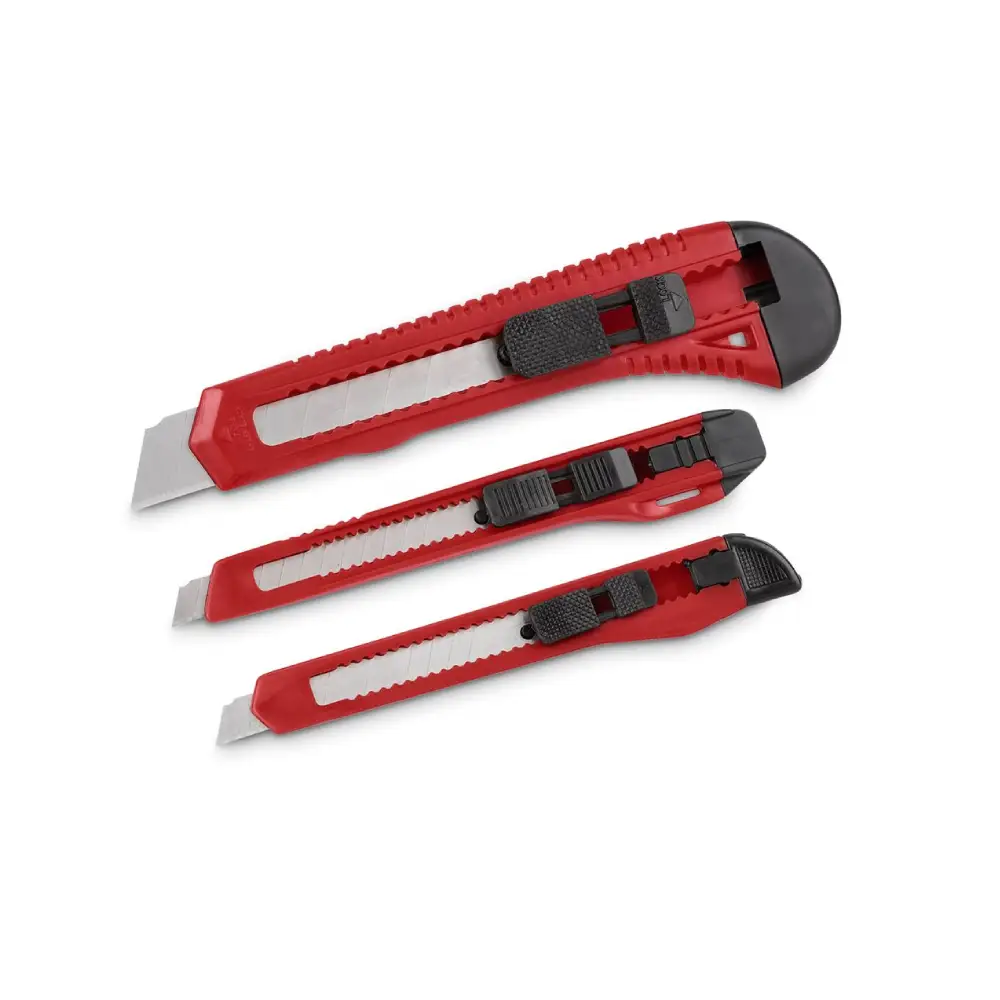 O Conjunto de 3 X-Atos da marca Kreator corta de forma fácil papel, papelão, papel de parede, fita adesiva e outros materiais.