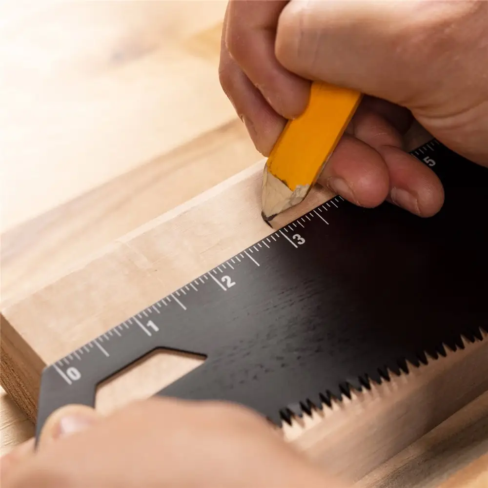 - Dentes endurecidos por indução para afiação duradoura Régua integrada e ângulos predefinidos de 90°, 45° e 30° para marcação fácil