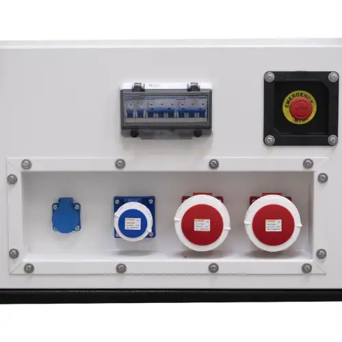 El generador cuenta con: 2 tomas trifásicas UE de 32 A 1 toma monofásica UE de 16 A 1 toma Schuko de 16 A Estas tomas permiten alimentar simultáneamente equipos con cargas trifásicas y monofásicas, lo que lo hace adecuado para cualquier tipo de entorno. Tiene un factor de potencia de 0,8, una corriente nominal de 36,1 A, una clase de rendimiento G2 y una batería de 100 Ah, lo que ofrece fiabilidad, eficiencia y facilidad de uso.