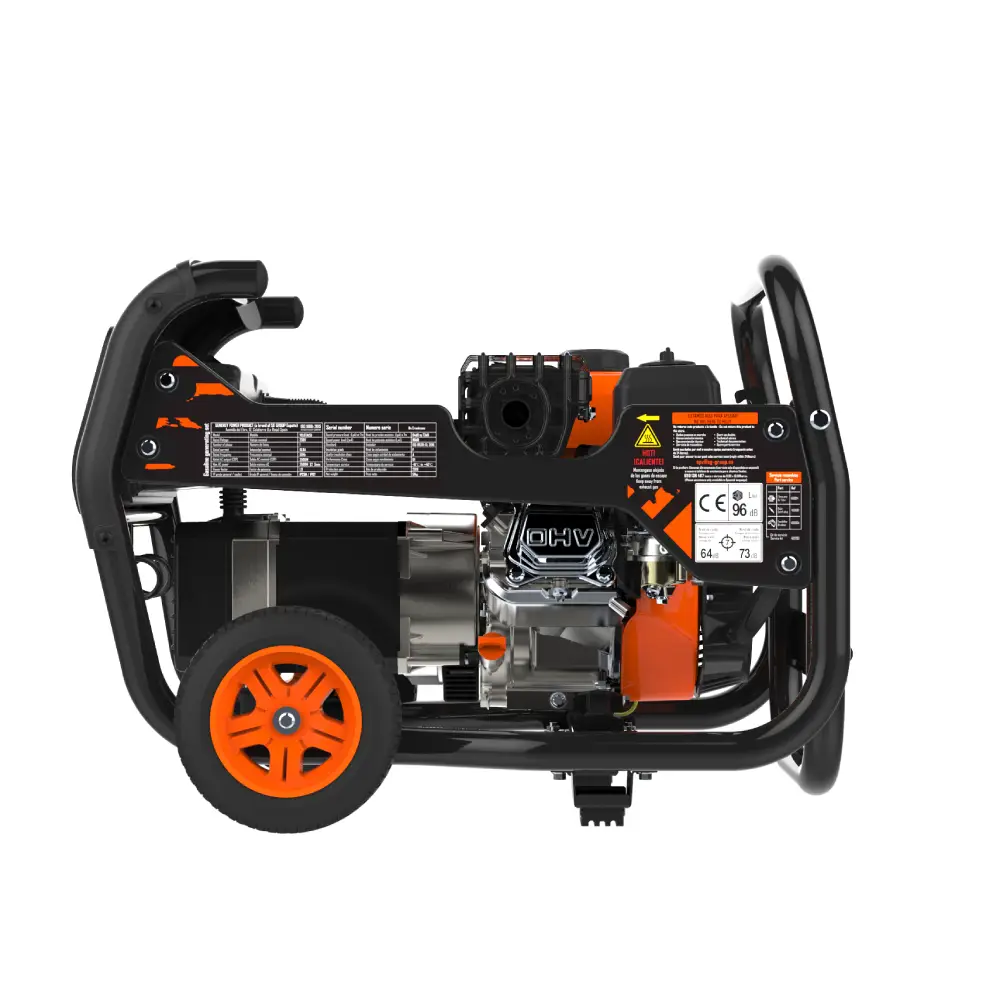 Equipado com motor Genergy SGB‑PRO Euro V de 208 cc, de 4 tempos e refrigerado a ar, oferece 2500 W de potência nominal e pico de 2800 W, com arranque manual por corda.