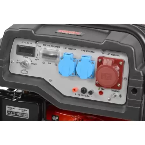 O motor do gerador é um motor a gasolina de 4 tempos com tecnologia OHV (Overhead Valve). Com uma cilindrada de 459 cm³ e uma potência de 14hp, oferece um desempenho potente. Possui um arranque elétrico conveniente, o que facilita a partida do gerador. Além disso, é fornecida uma bateria, garantindo um arranque fácil e rápido. O depósito de combustível possui uma capacidade de 25 litros e está equipado com um manómetro de nível, permitindo que o utilizador monitorize o nível de combustível com facilidade.