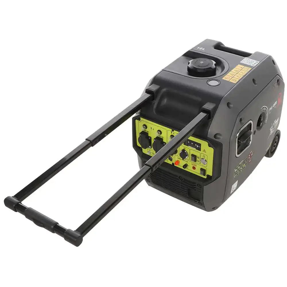 É leve, compacto e oferece um excelente desempenho com uma potência máxima de 4200 W, autonomia de 9,7 horas e um baixo nível de ruído. Conta ainda com uma pega de transporte extensível, que permite deslocar o gerador com facilidade, funcionando em conjunto com as rodas traseiras para facilitar o transporte do equipamento sem esforço excessivo.