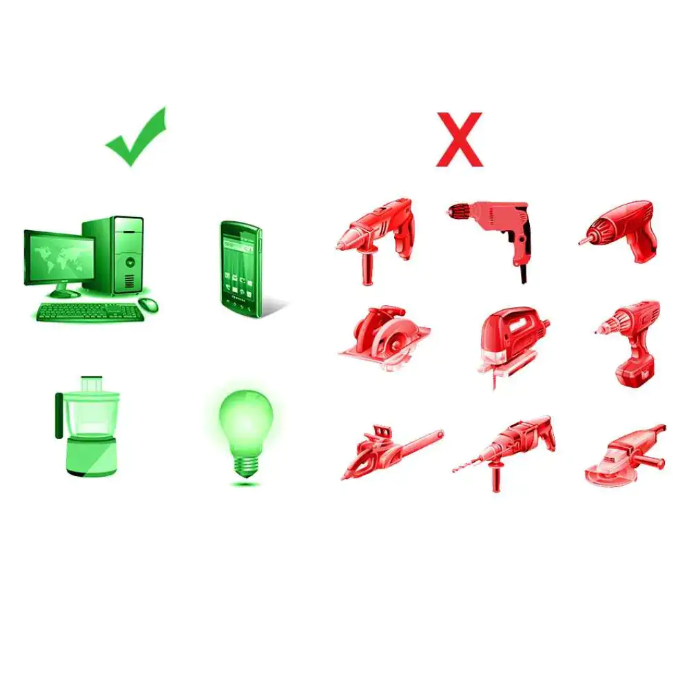 Este Gerador é ideal para equipamentos eletrónicos sensíveis (computadores, telemóveis, luzes) devido à tecnologia Inverter, mas evite o uso de ferramentas elétricas com um elevado nível de potência que possam causar picos de carga excessivos!