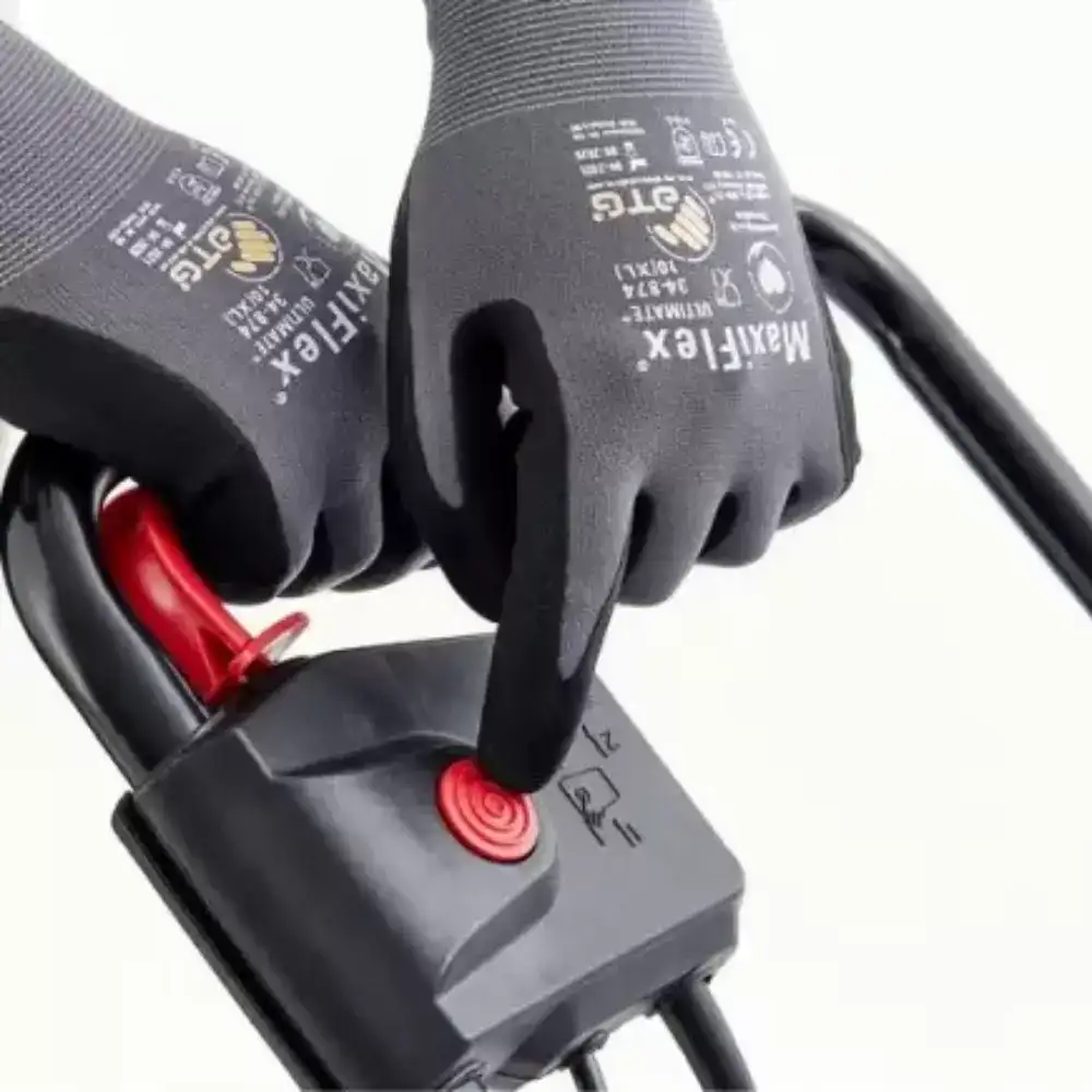 O ajuste é feito centralmente através do elemento de controlo na roda frontal do lado esquerdo. Os resíduos cortados e penteados são recolhidos num cesto com 35 litros de capacidade. A área recomendada para escarificação é de até 800 m²!