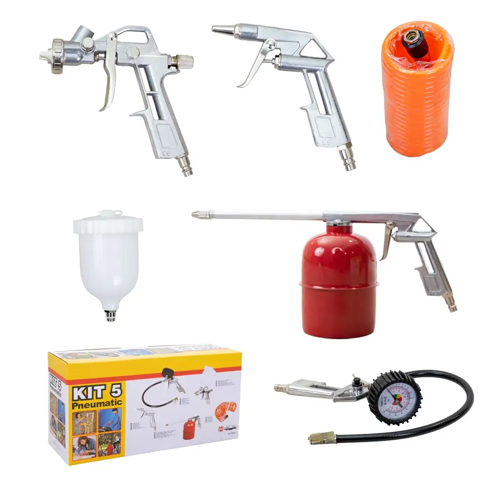 Kit para compresor, compuesto por 5 piezas: 1 pistola de pintura y depósito superior; 1 pistola sopladora; 1 pistola infladora de neumáticos, etc. #236fa1;">Pistola de lavado.