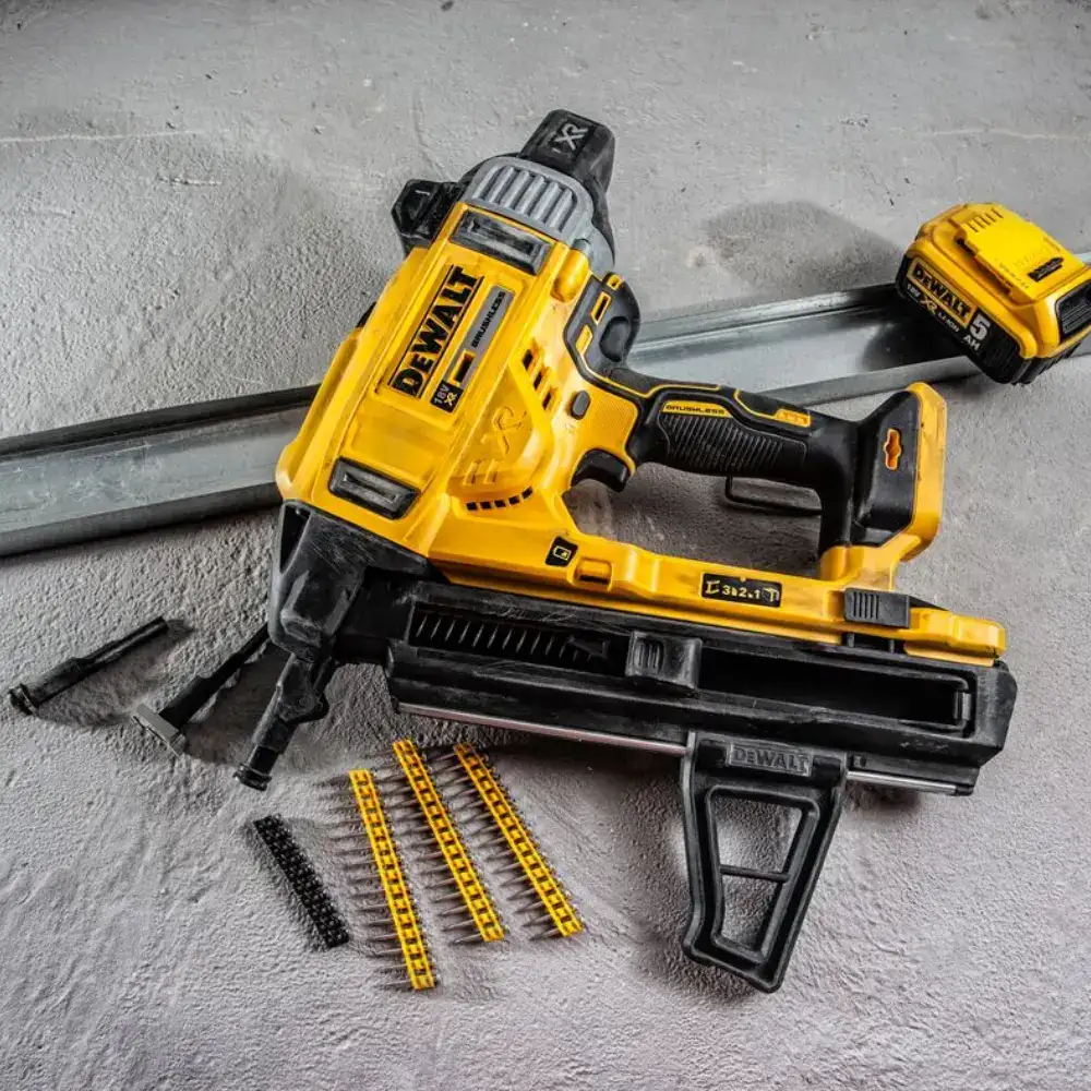 Kit DeWALT composto por uma Pregadora Betão sem escovas a bateria + 50 caixas Pregos, concebido para utilização tanto em aço como em betão.