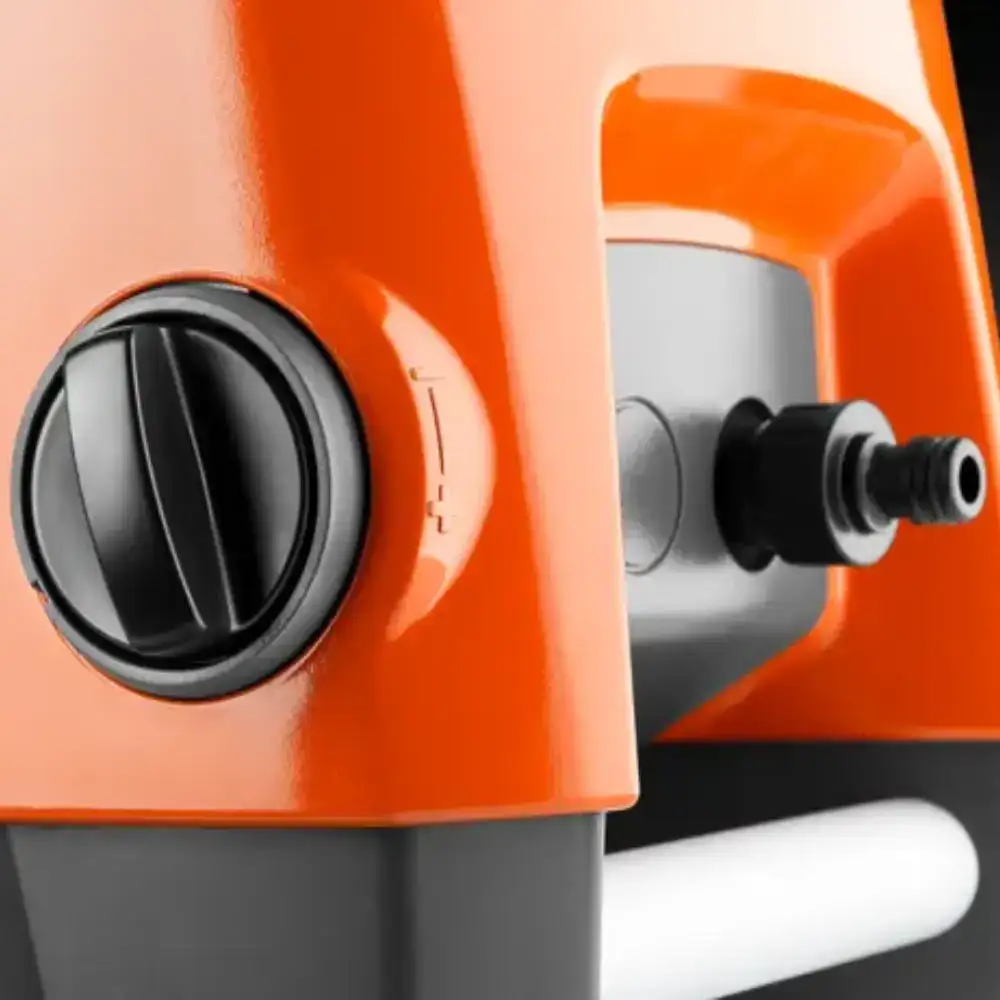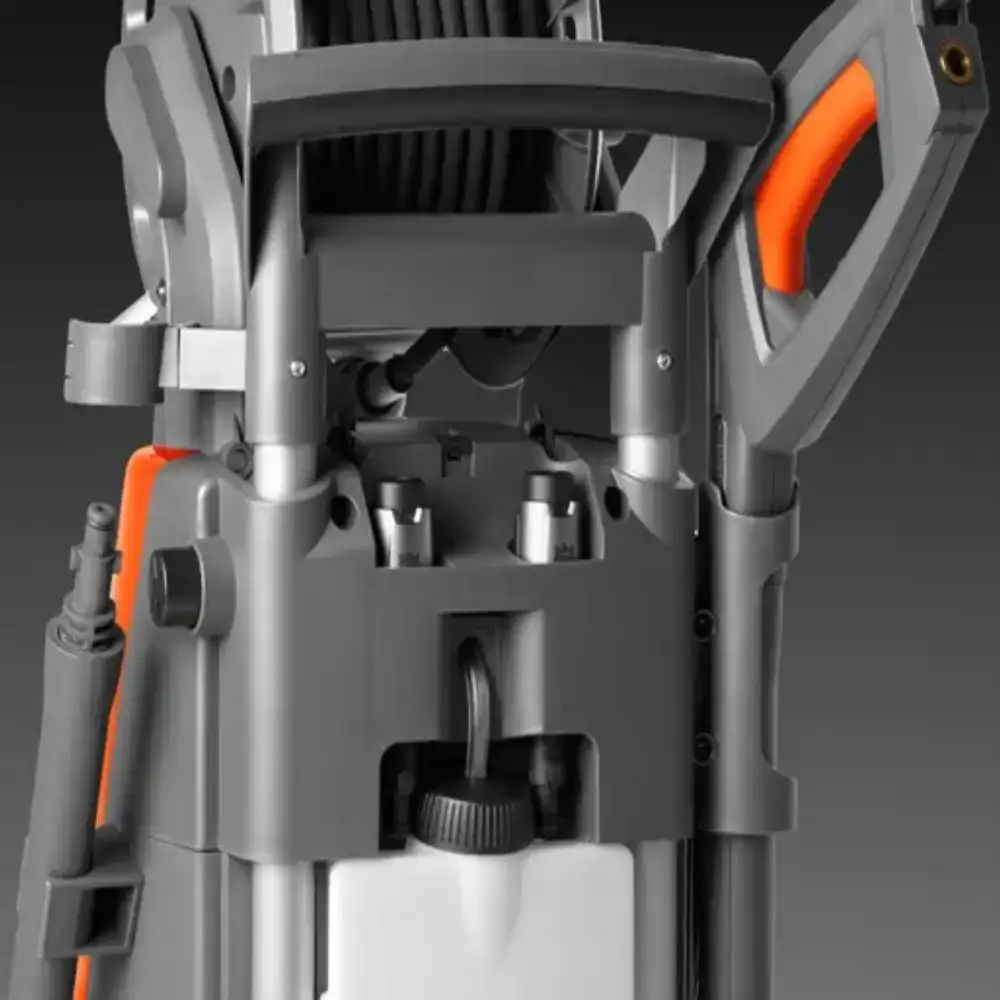 Conta com duas funções giratórias (ajuste do bocal e conexão rápida), que evitam complicações. Esta máquina inclui um botão "liga/desliga" e um  botão doseador de químico na parte frontal.